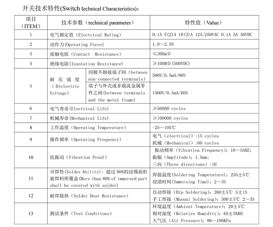 | 1 | Электрические характеристики | 0,1 А 5(2) А 10(3) А 125/250 В переменного тока 0,1 А 5 А 36 В постоянного тока | |